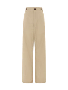 The Alia Trousers in cashew are a straight-leg, high-waisted style tailored from a smooth cotton drill. The trousers feature side tabs secured with brown tortoiseshell buttons, belt loops, and front and back pockets. These trousers have a structured look while allowing ease of movement.