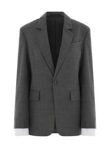 The Maud Jacket in gunmetal is a single-breasted jacket tailored in 100% virgin wool. This style features an unexpected built-in stripe cotton cuff, adding a casual, easy-going touch to the piece. A classic tailoring staple for Spring, the Maud also comprises neat lapels, jetted flap pockets, and a single vent at the back.