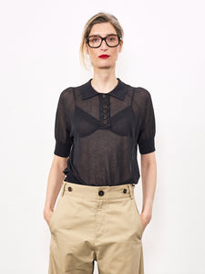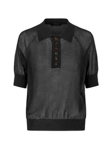 The Kieran Top in caviar is a sheer knitted polo shirt featuring a winged collar, short raglan sleeves, and a polo placket with six tortoiseshell buttons. Crafted from an airy cotton-poly mix for lightweight comfort with subtle stretch, ideal for layering over your favourite bra or cami.